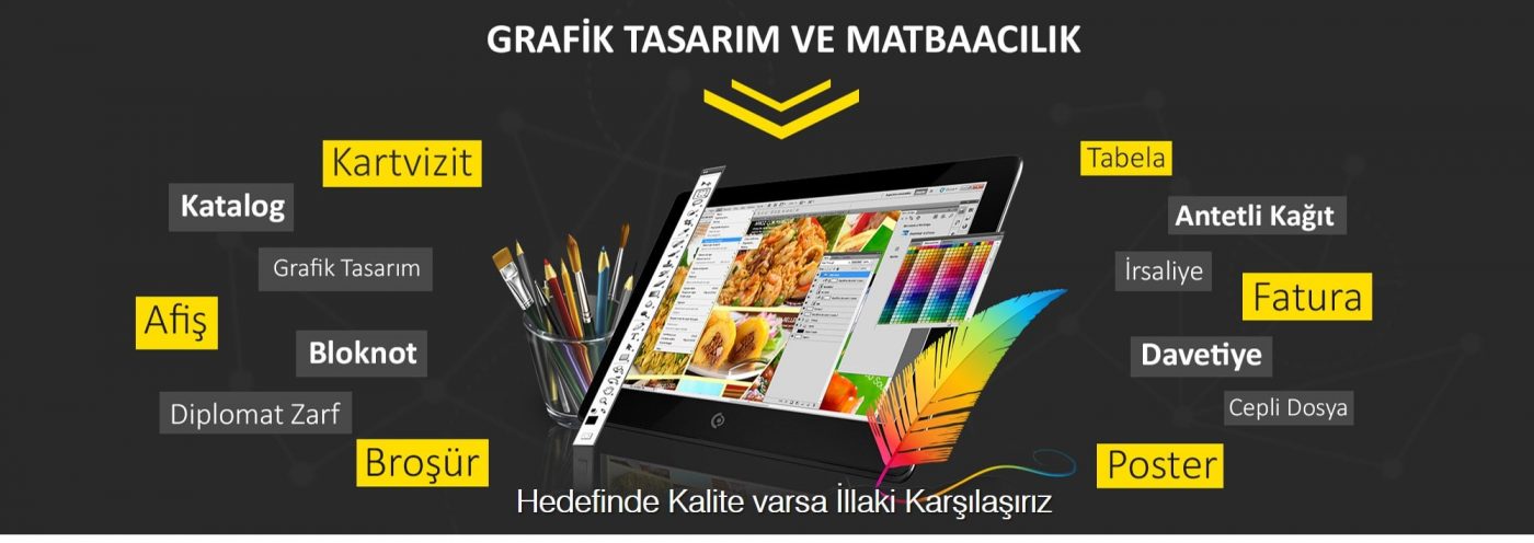 Matbaa Hizmetleri ; Ürünlerinizin tanıtım ve pazarlamasında tüm Matbaa işlerinizin tasarım ve uygulamasını yaparak, fotoğraf çekimleri, renk ayrımı, grafikten baskılı hale dönüşünceye kadar kullanılan tüm basılı dökümanları hazırlayarak siz müşterilerimizin kullanıma, üstün kalite baskısı ile sunuyoruz.